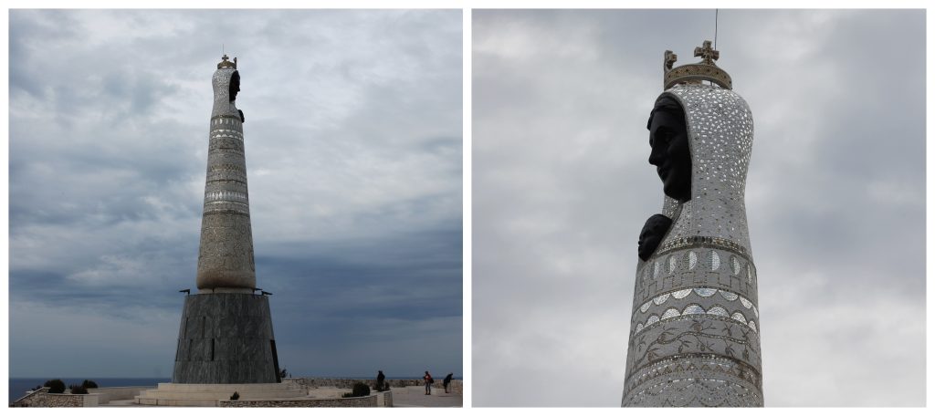 Kad smo prethodno veče pristizali u Primošten, vidjeli smo putokaz za vidikovac Gospe od Loreta ali već je pao mrak, a i taj naziv nas nije naročito privukao. Kad smo bacili pogled kroz prozor apartmana vidjeli smo osvijetljeni vrh obližnjeg uzvišenja. Stanodavka nam je rekla da je to spomenik posvećen Gospi od Loreta i da sjutradan neizostavno pođemo tamo, prije svega zbog najljepšeg pogleda na Primošten i okolinu. Nismo se pokajali što smo je poslušali. Kip Gospe od Loreta, koji je smješten na sredini vidikovca, zajedno s postoljem, visok je 17 metara, tačno desetinu visine brda Gaj na kojem je smješten. Kip je od betona, a završna obrada je mozaička, od zlata, srebra i bojanog stakla. Ovaj kip se nalazi na međunarodnim hodočasničkim rutama marijanskih svetilišta povezanih s Gospom od Loreta. Osim Primoštena na spisku su i Rim, Beč, Krakov, Lisabon, Madrid, Pariz, Brisel i drugi gradovi. Naravno, nije ovaj kip slučajno postavljen na ovom mjestu. Postoji legenda kako je slika Gospe od Loreta spasila stanovnike ovoga grada od kuge 1835. godine. Spomenik je impresivan, kako zbog veličine, tako i zbog izgleda. Priznajem da nikad ranije nijesam vidjela sličan.